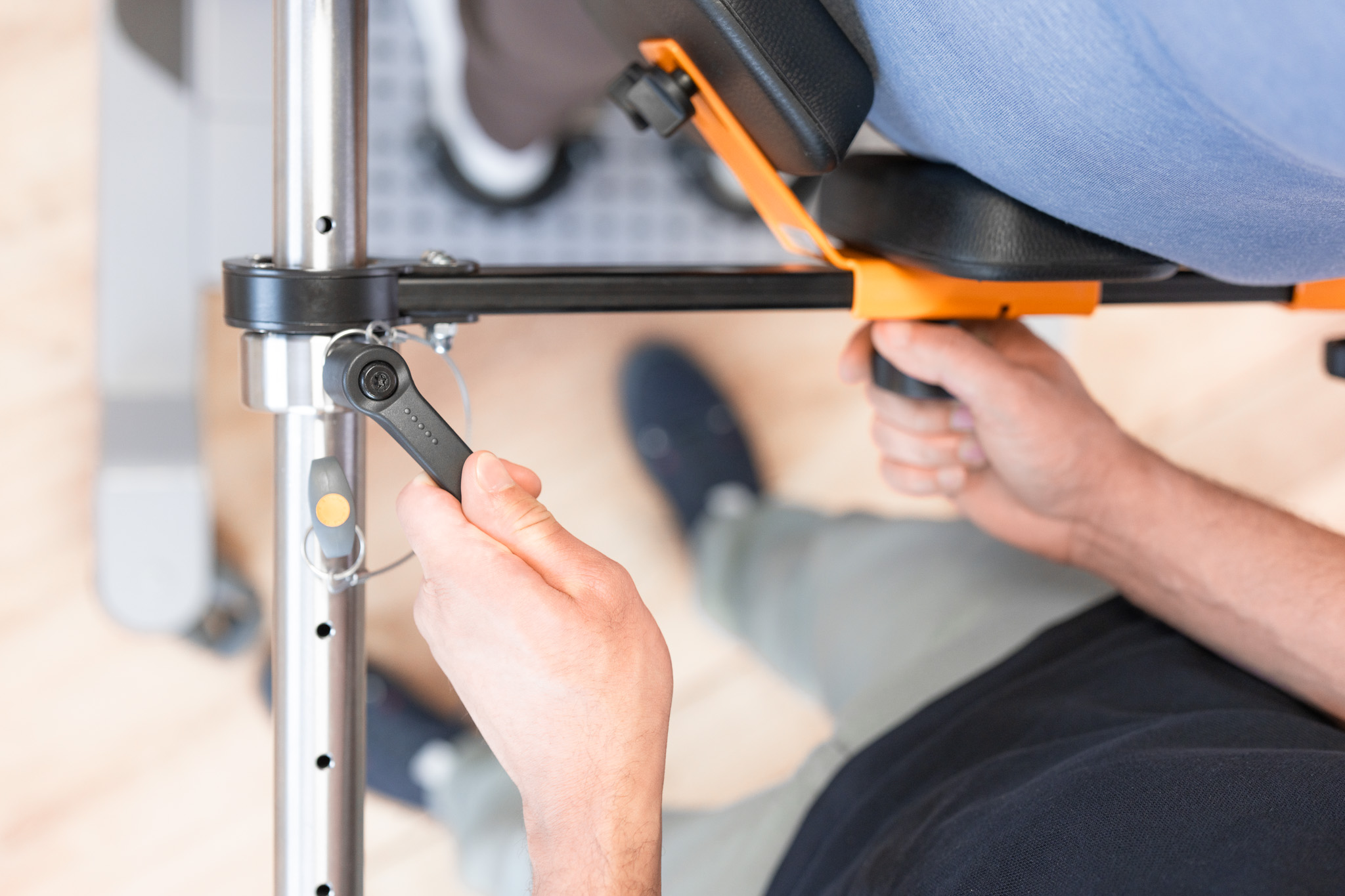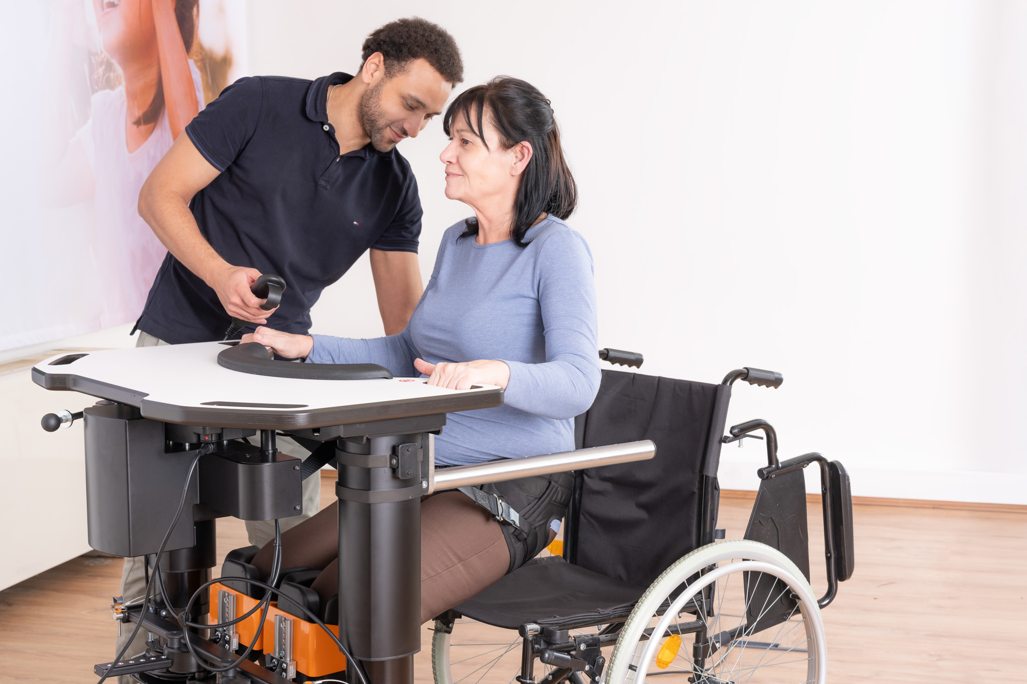 Das System unterstützt Patient:innen beim Übergang vom Sitzen zum Stehen und ermöglicht eine kontrollierte, sichere Standposition – auch bei fehlender eigenständiger Standfähigkeit.