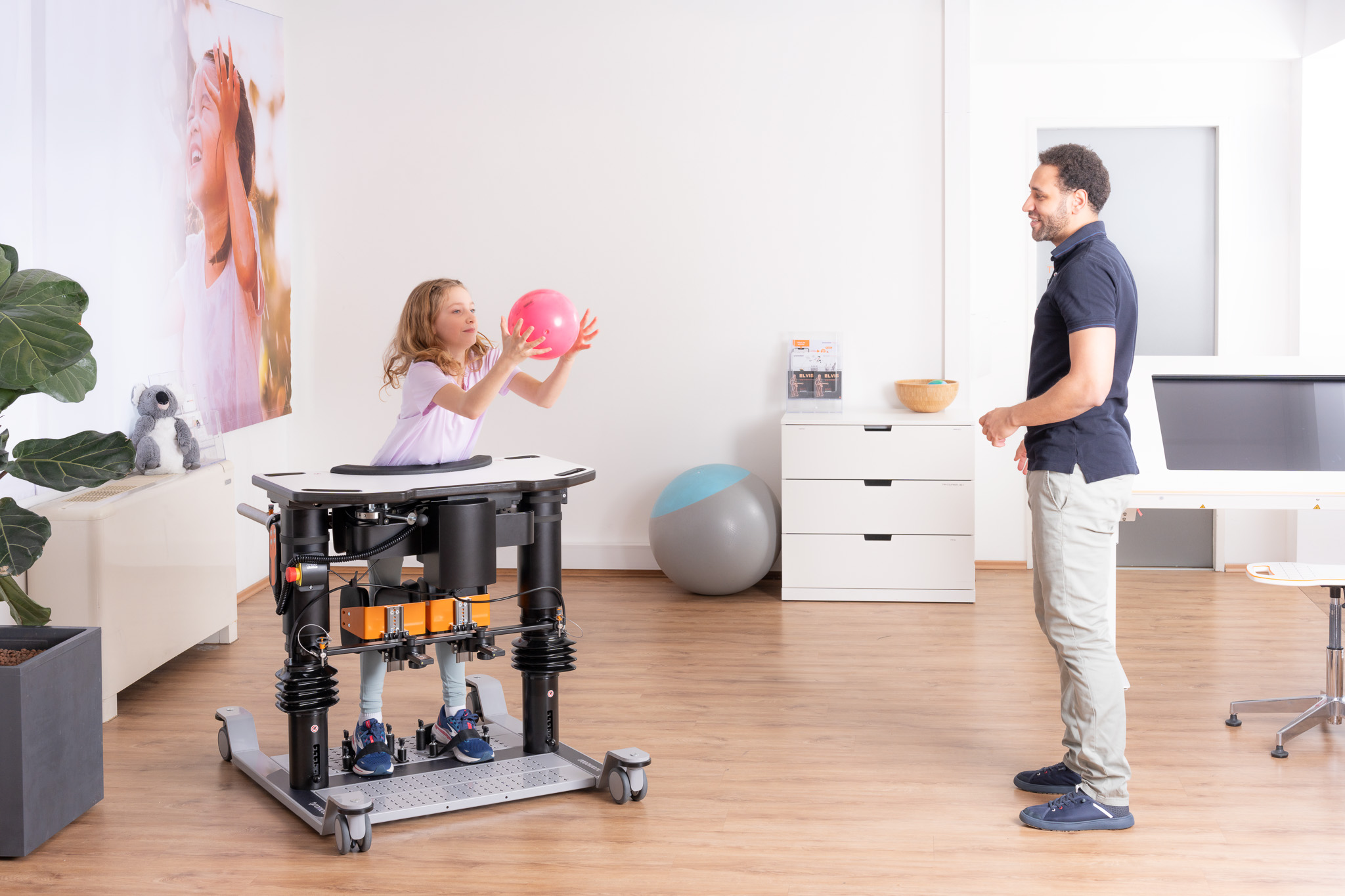 Elvis ist ein Steh- und Balance-Therapiesystem für die sichere Vertikalisierung, das Training der posturalen Kontrolle und die Frühmobilisation in der modernen klinischen Rehabilitation.
